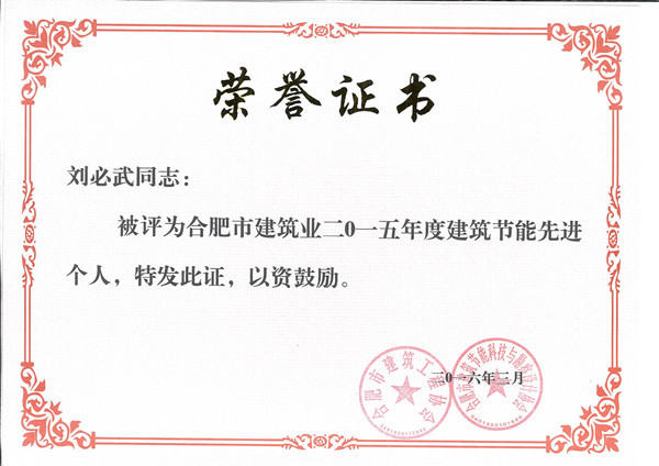 大會現場宣讀了有關表彰通報,安徽省詠梅新型建材有限公司董事(shì)長(cháng)劉必武榮獲“合肥市建築業2015年度建築節能(néng)先進(jìn)個人”榮譽稱号,省市領導親自頒發(fā)榮譽證書并合影。建築節能(néng)先進(jìn)企業和先進(jìn)個人的評選活動,旨在弘揚節能(néng)減排、綠色建築精神,鼓勵和表彰在我市建築節能(néng)行業發(fā)展中作出突出貢獻的企業和個人,提高我市整個建築行業的節能(néng)意識,進(jìn)一步推廣建築節能(néng)高效技術,宣傳建築節能(néng)行業的先進(jìn)經(jīng)驗。